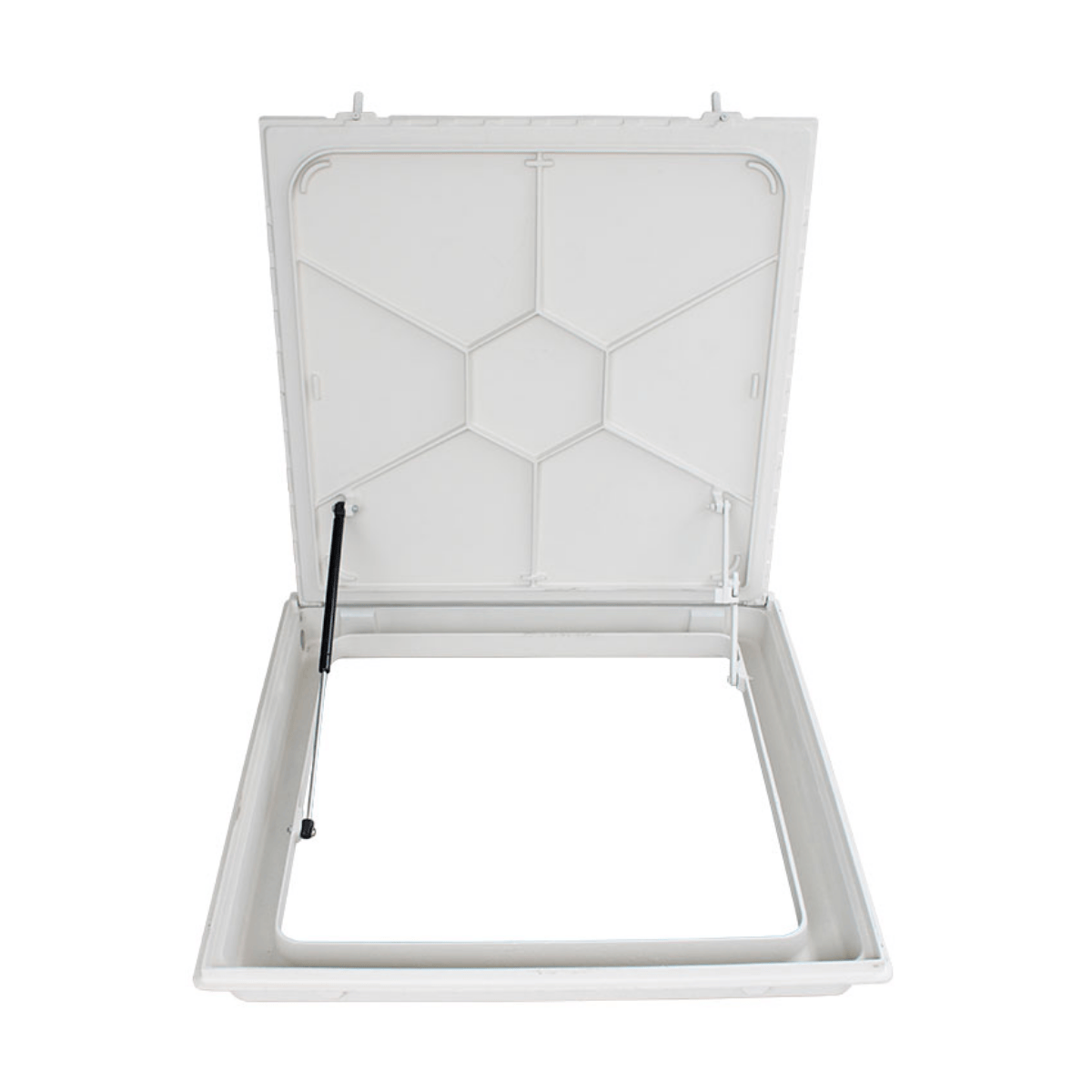 Tampa casa de máquina design Colmeia com rebaixo para assentamento de cerâmicas, grelha invisível, puxadores articulados embutidos. Sistema de abertura com amortecedor